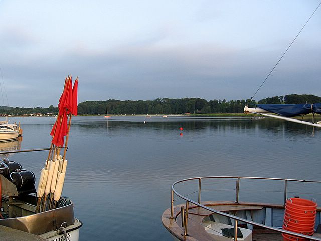 Vorbei an Fischerbooten geht der Blick aufs Wasser. Im Hafen Hejlsminde.