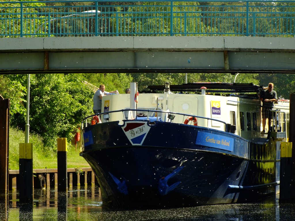 Ein dicker Holländer verlässt die Schleuse Diemitz