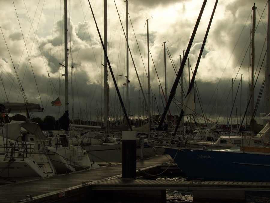 Bei der Bootsübernahme in Kröslin erwischt uns eine Regenfront.
