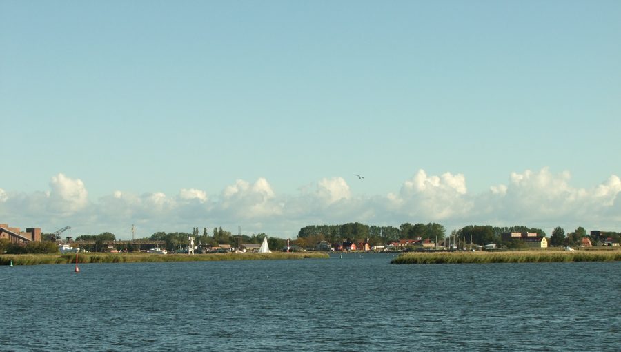 Vor uns die Ausfahrt aus dem Krösliner See in den Peenestrom.