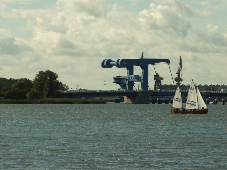 Die Peenebrücke Wolgast, eine Straßen-und Eisenbahn-Klappbrücke, liegt vor uns.