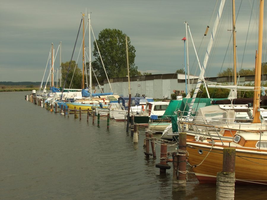 Am kleinen selbsgebauten Hafen des YCP Anklam warten wir auf die Öffnung der Eisenbahnbrücke Anklam.